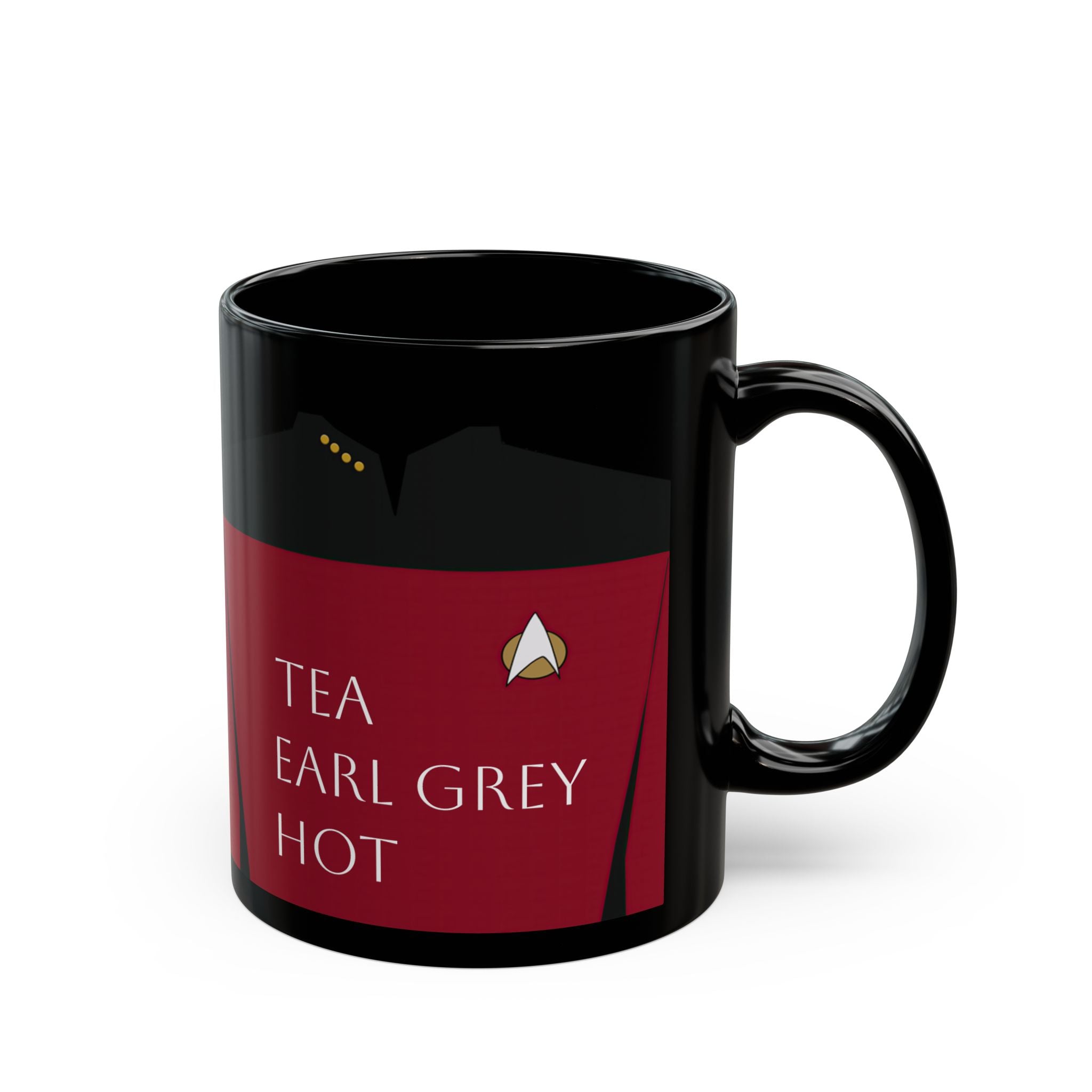 A stylish black ceramic mug with a glossy finish featuring a Picard Make It So design, perfect for all Star...
