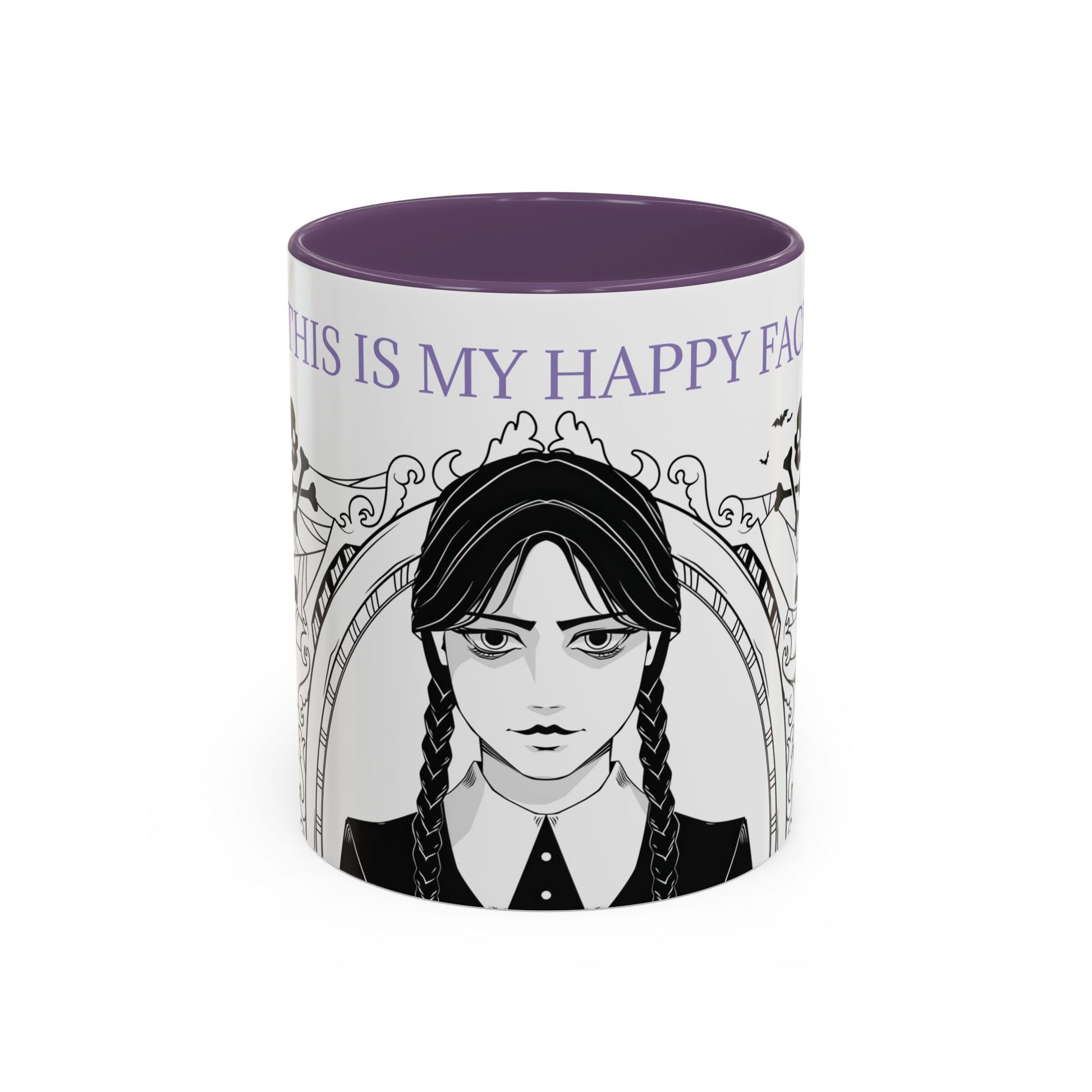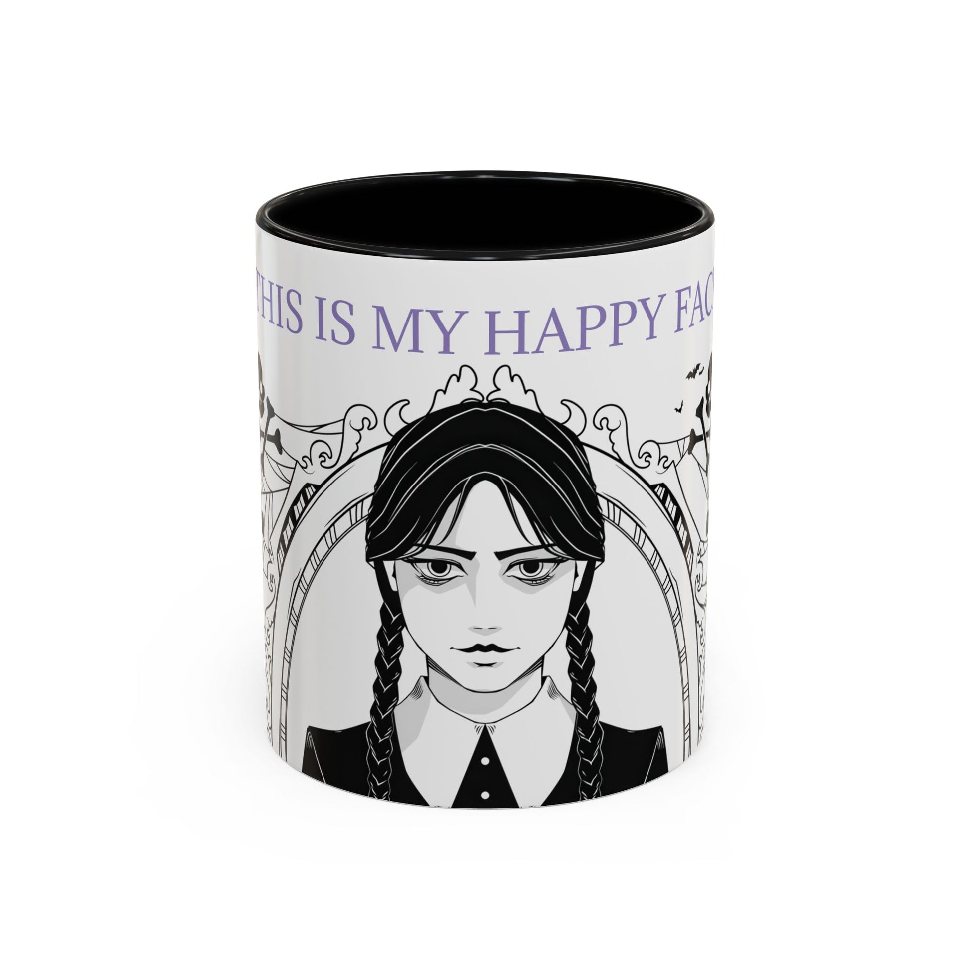 A quirky and fun Wednesday Addams Mug, perfect for starting your day with a smile. This Is My Happy Face Cup is ideal for fans of the Addams Family and those who appreciate dark humor.